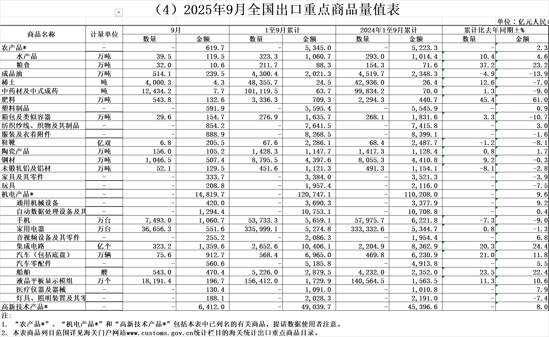 编者按:今年前三季度,我国货物贸易进出口33.61万亿元,同比增长4%。其中,出口19.95万亿元,同比增长7.1%; 进口13.66万亿元,同比下降0.2%。9月当月,进出口4.04万亿元,同比增长8%。海关总署副署长王军表示,前三季度,我国出口机电产品12.07万亿元,增长9.6%,占出口总值的60.5%,提升了1.4个百分点。其中,出口电子信息、高端装备、仪器仪表等高技术产品分别增长8.1%、22.4%和15.2%;“新三样”产品、铁道电力机车等绿色产品增速均达到两位数。