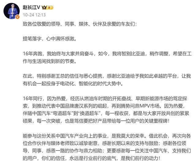 10月24日,腾势方程豹直营事业部总经理赵长江在其个人社交媒体上发文确认离职。他表示,“将暂别比亚迪,稍作调整,希望在工作与生活间找到新的节奏。”