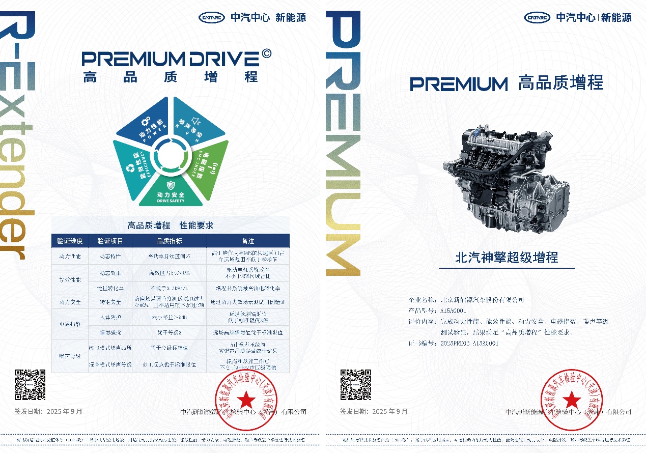 据了解,北汽神擎增程动力历经三轮次耐久验证、30万次启停耐久验证,平台耐久累积验证超2万小时,获得了中汽研“高品质增程”权威认证。